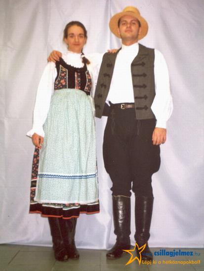 Férfi: bőujjú fehér ing, fekete csizmanadrág, zsinóros mellény