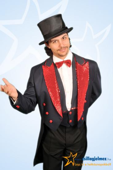 Flitteres díszítésű frakk zakó, hozzátartozó mellénnyel, csokornyakkendővel.